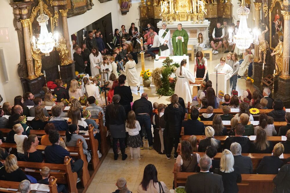 Ein herzliches Danke allen, die so schön mitgestaltet und mitgefeiert haben: Dies waren die Kindergartenkinder (Erntedank Tanz), die Minis und MS-Schüler*innen (Zeichenhandlung mit Erntegaben), die Landjugend (Erntekrone), die Musikgruppe (begeisternde Musik) und viele mehr.